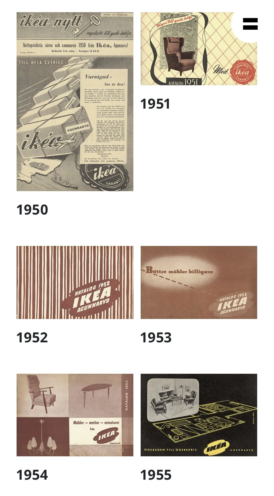 The first six editions of the IKEA catalogue, from 1950 through 1955: trippy and abstract; monochrome.